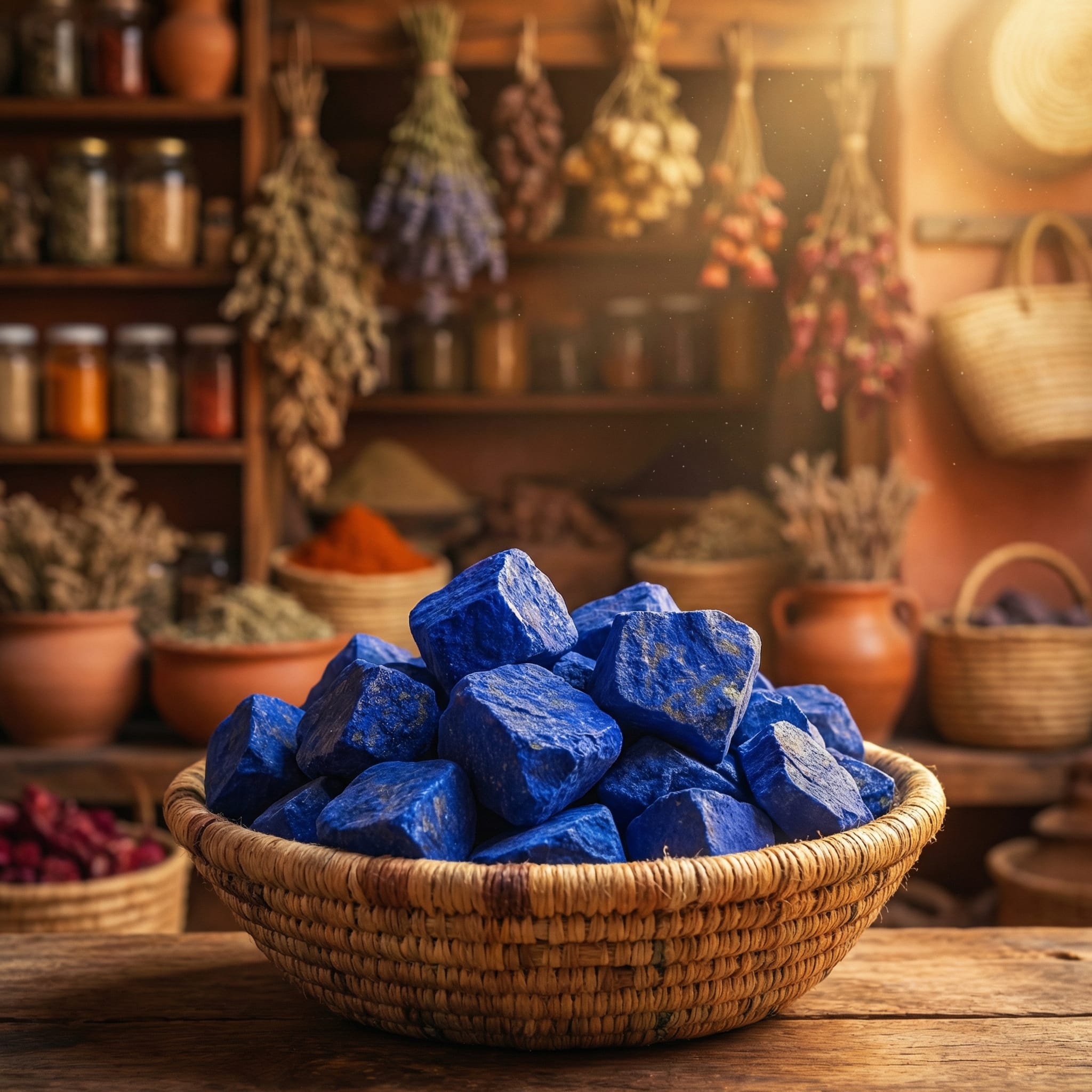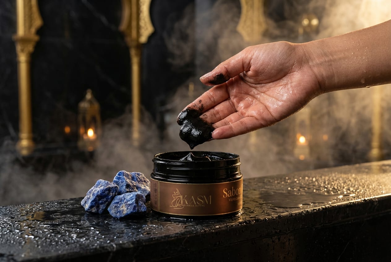 a traditional Moroccan blue mineral stone, known for its brightening and skin-evening properties.