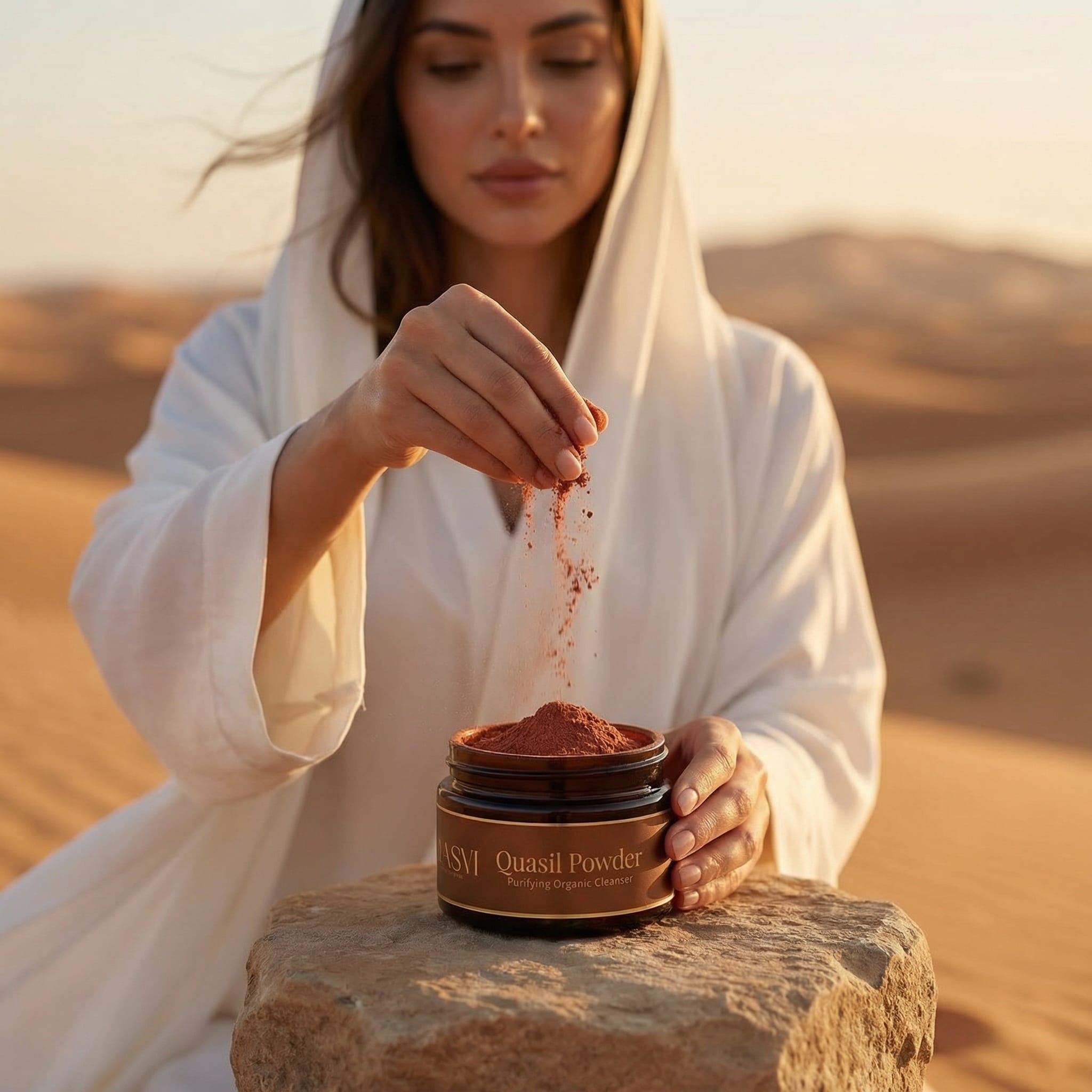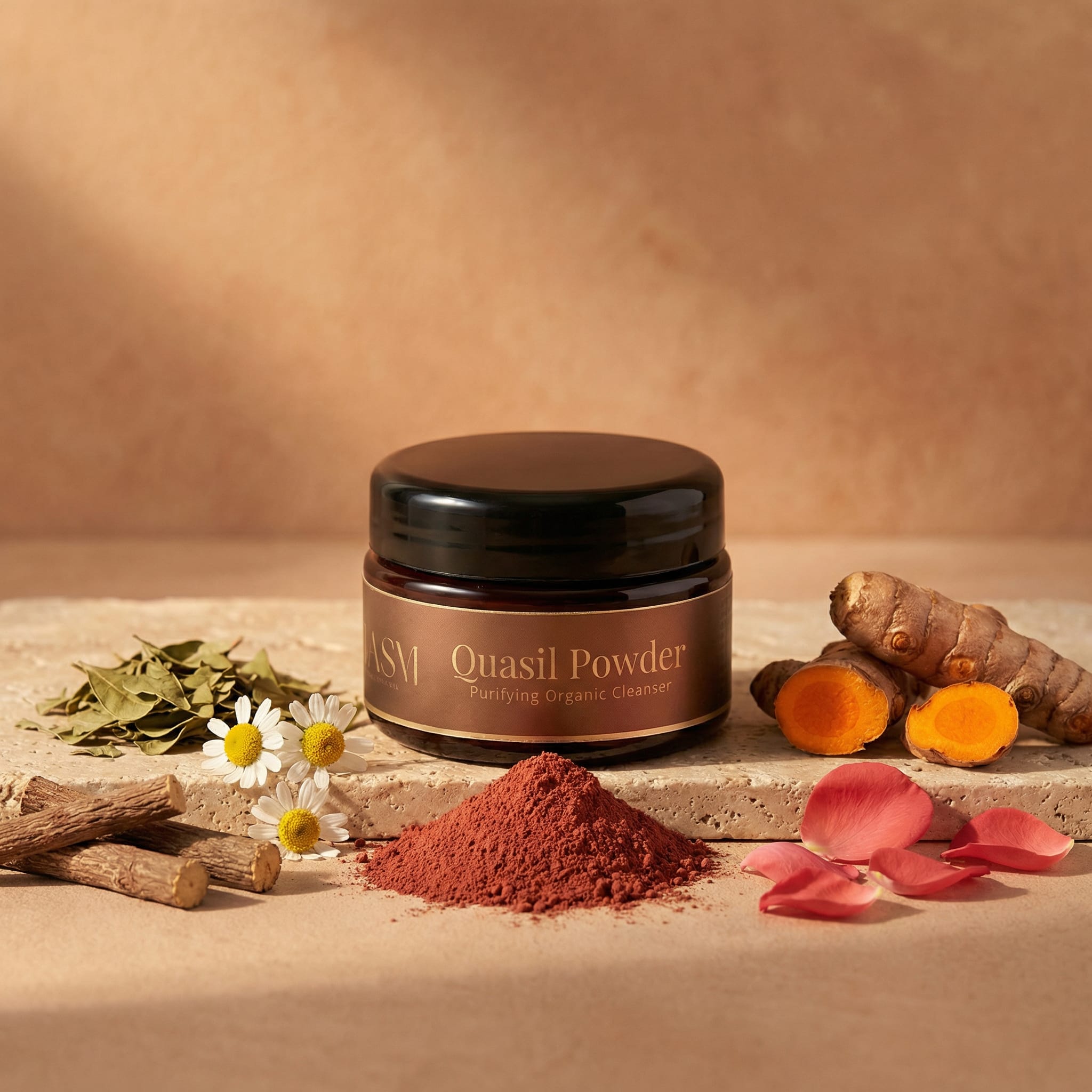 Traditionally used in Moroccan beauty practices, Quasil powder is gently activated and applied to cleanse and renew the skin.