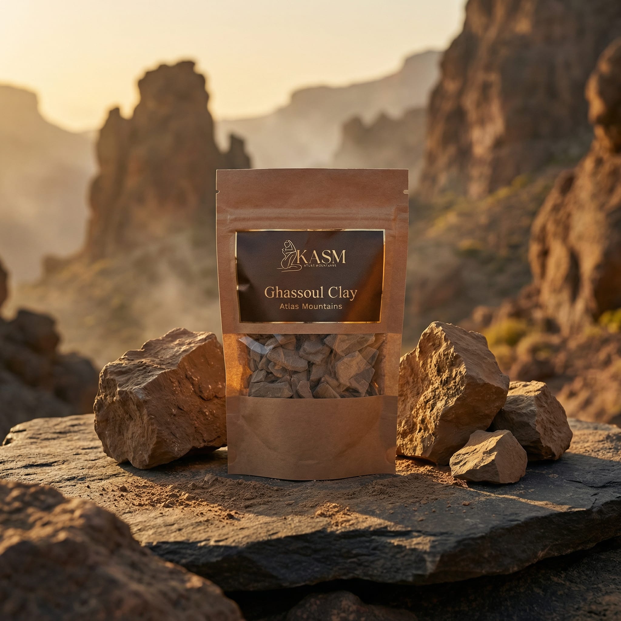 Mineral-rich lava clay formed in the volcanic regions of Morocco, traditionally harvested and sun-dried to preserve its natural purity